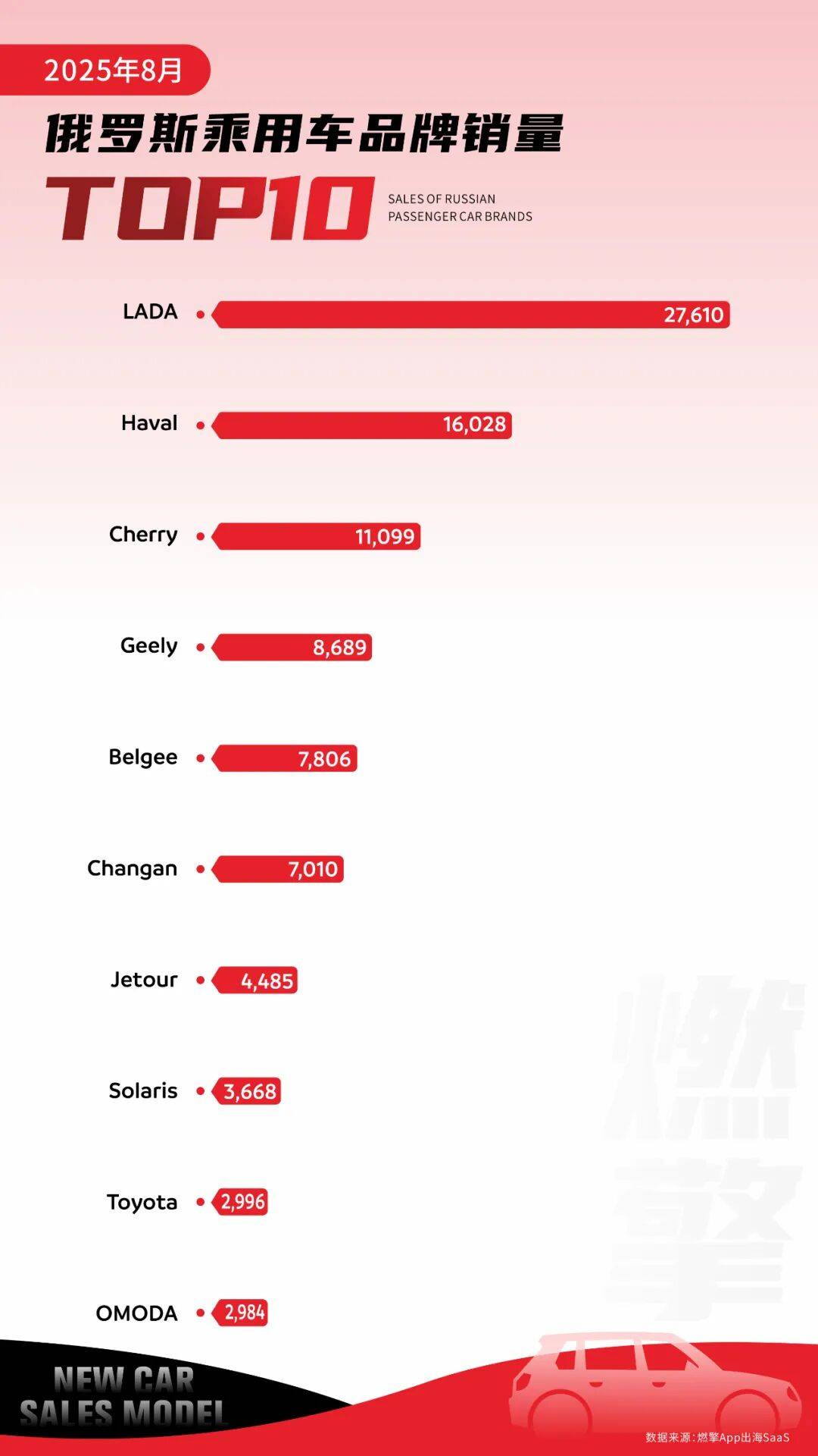 韓國Solaris(3668輛)、日本豐田(2996輛)銷量低迷,反映出歐美、日系品牌因地緣等因素,在俄羅斯市場份額大幅萎縮,產品供應和本地化運營能力嚴重不足,市場影響力持續衰退。