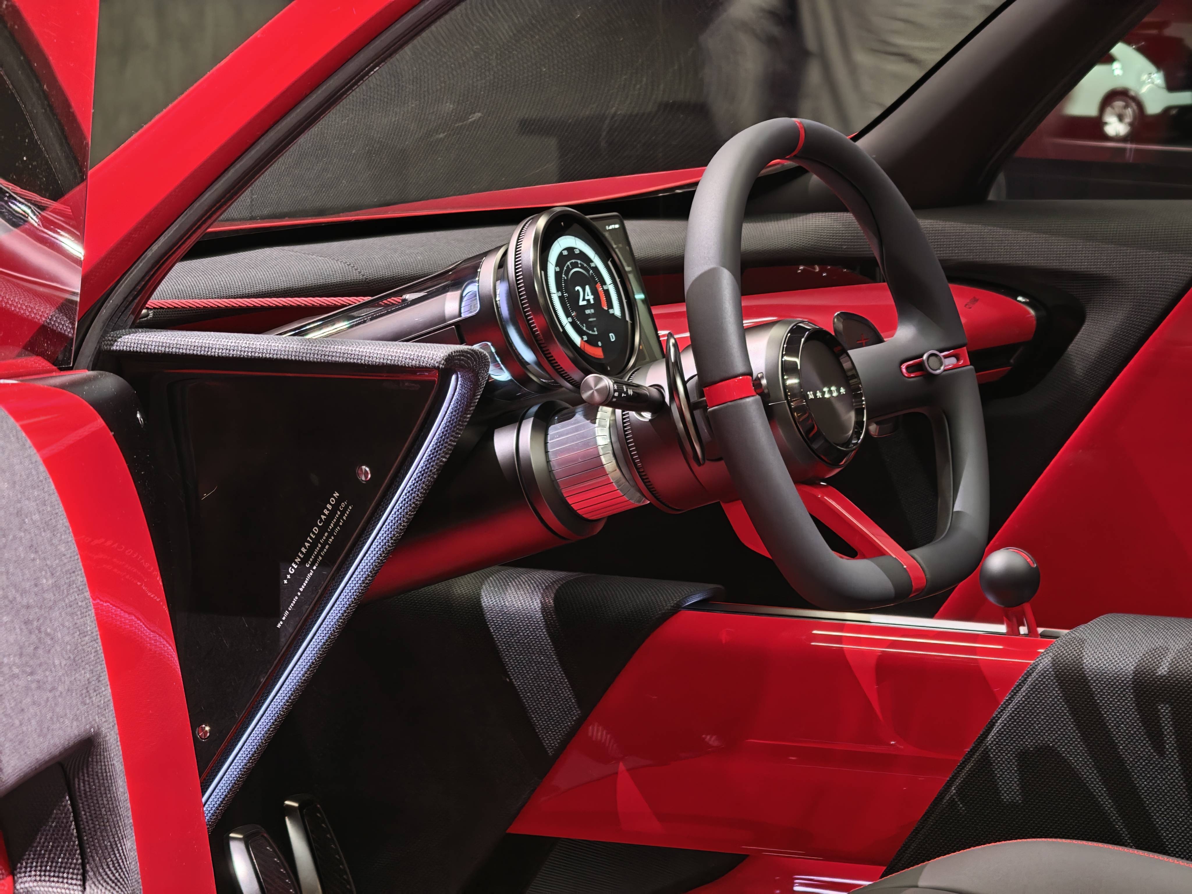 儀表臺很有賽博朋克感,圓形儀表再加上圓形轉向柱,相當于把前IP臺功能分離開,另外右側還有手機支架,直接用智能手機替代了中控大屏。