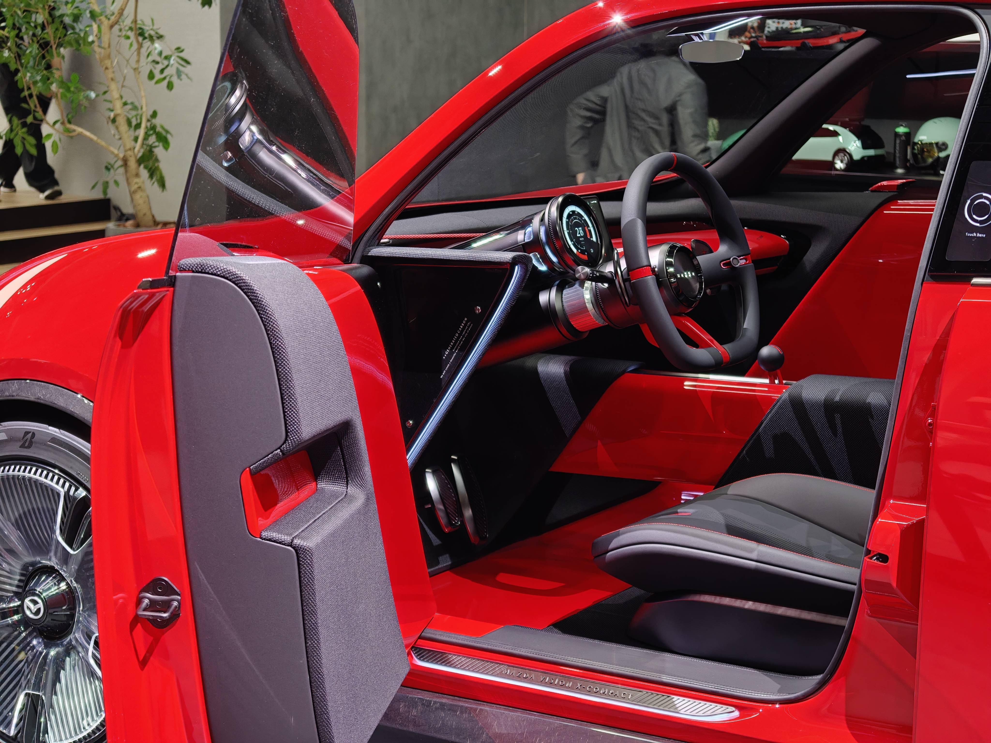一個細節是,前排車門有一塊碳纖維固定式擋板,上面有氛圍燈,車門關閉時會合成一體,具體有什么作用還不太清楚,但馬自達強調這一塊是用再生碳制作,回收了二氧化碳。
